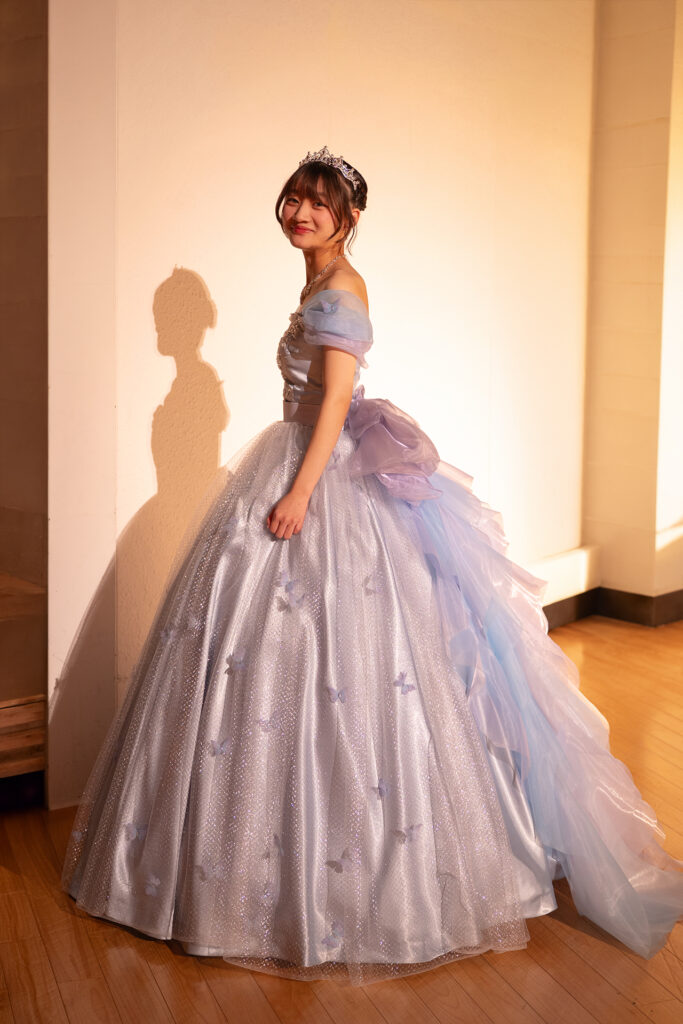 強い光と繊細な透明感が重なり合い、ランウェイ上で完成するドレスを目指しました。私の好きな淡いブルーを基調に、バックスタイルにはオーガンジーを幾重にも重ねて流れるラインを表現しました。歩くたびにドレープが変化し、優雅なシルエットが生まれます。