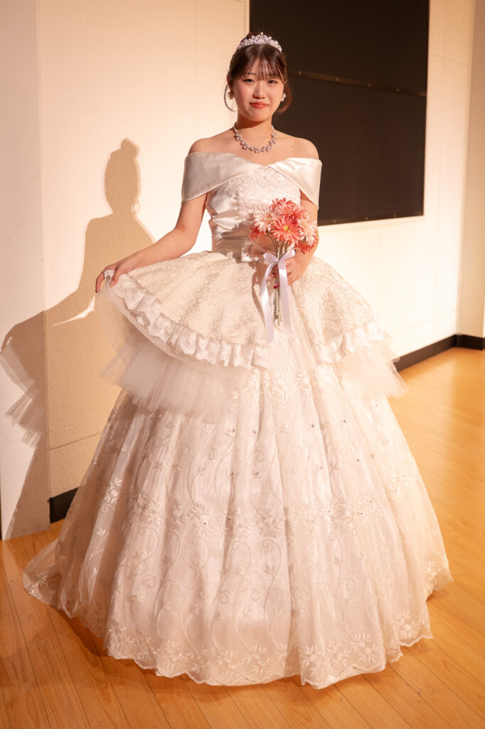 白とゴールドを基調に、上品さとやさしい華やかさを大切にしてデザインしました。白は透明感や純粋さを、ゴールドは内側からにじみ出る輝きを表しています。スカートは二段構造にすることで、ふんわりとしたボリューム感と奥行きを演出しました。動くたびに表情が変わり、特別感のあるシルエットになるよう意識しています。ビスチェには刺繍の上にビジューを配置し、派手になりすぎない上品なきらめきで、ドレス全体を引き締めています。可憐なプリンセスの世界観を大切にしながら、今の時代に合った洗練された一着を目指しました。