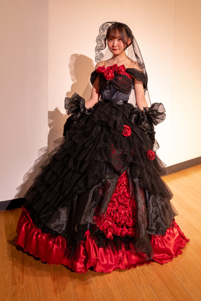 黒を基調に赤い薔薇を組み合わせ、ゴシック調の世界観を表現したロングドレスです。黒のチュールを用いることで、強さの中に儚さや奥行きを持たせました。赤い薔薇には「情熱」や「覚悟」という意味を込め、これまでの短大生活の集大成として、最後まで自分らしくありたいという思いを表現しています。終わりでありながら新たな一歩でもある“最後の製作”に、これまで積み重ねてきた時間や経験、そして未来へ進む自分自身への決意をすべて込めた一着です。